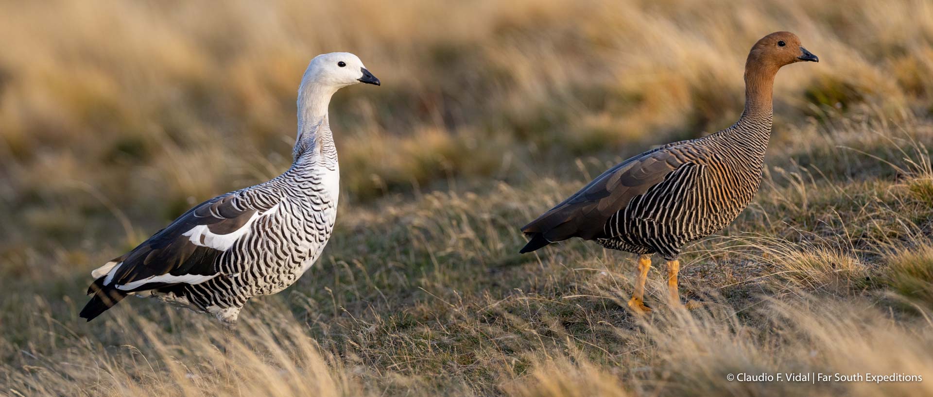 Ganso abundante en la estepa. El macho es blanco, la hembra parda. Forman parejas de por vida y defienden su territorio.