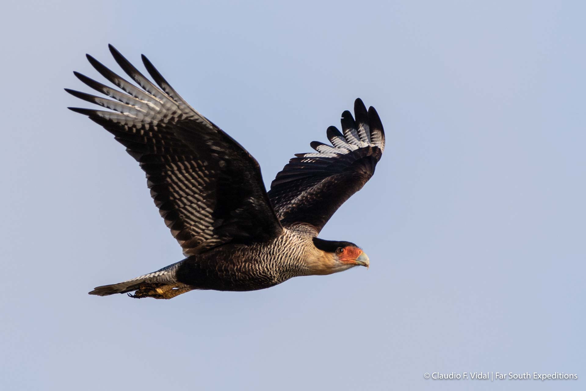 Rapaz grande, de cuerpo oscuro y cabeza con "gorra" negra. Común en Magallanes, carroñera y versátil.