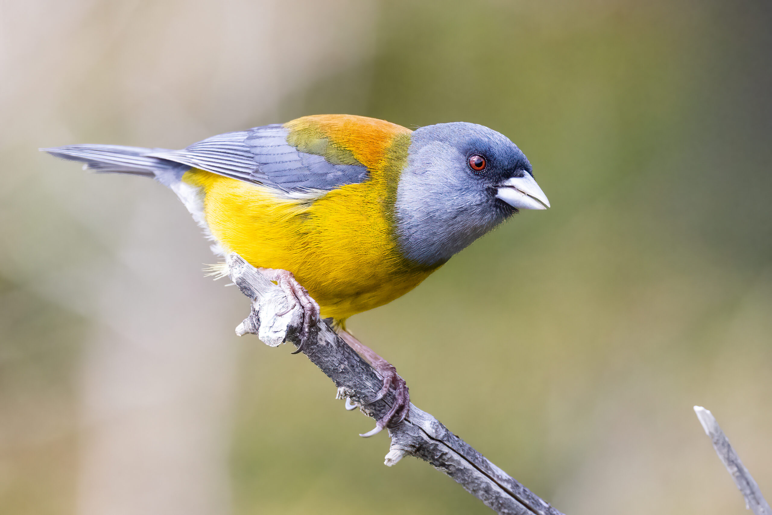 Ave pequeña y colorida del sur de Chile. El macho destaca por su plumaje amarillo y cabeza gris. Vive en bosques y matorrales.