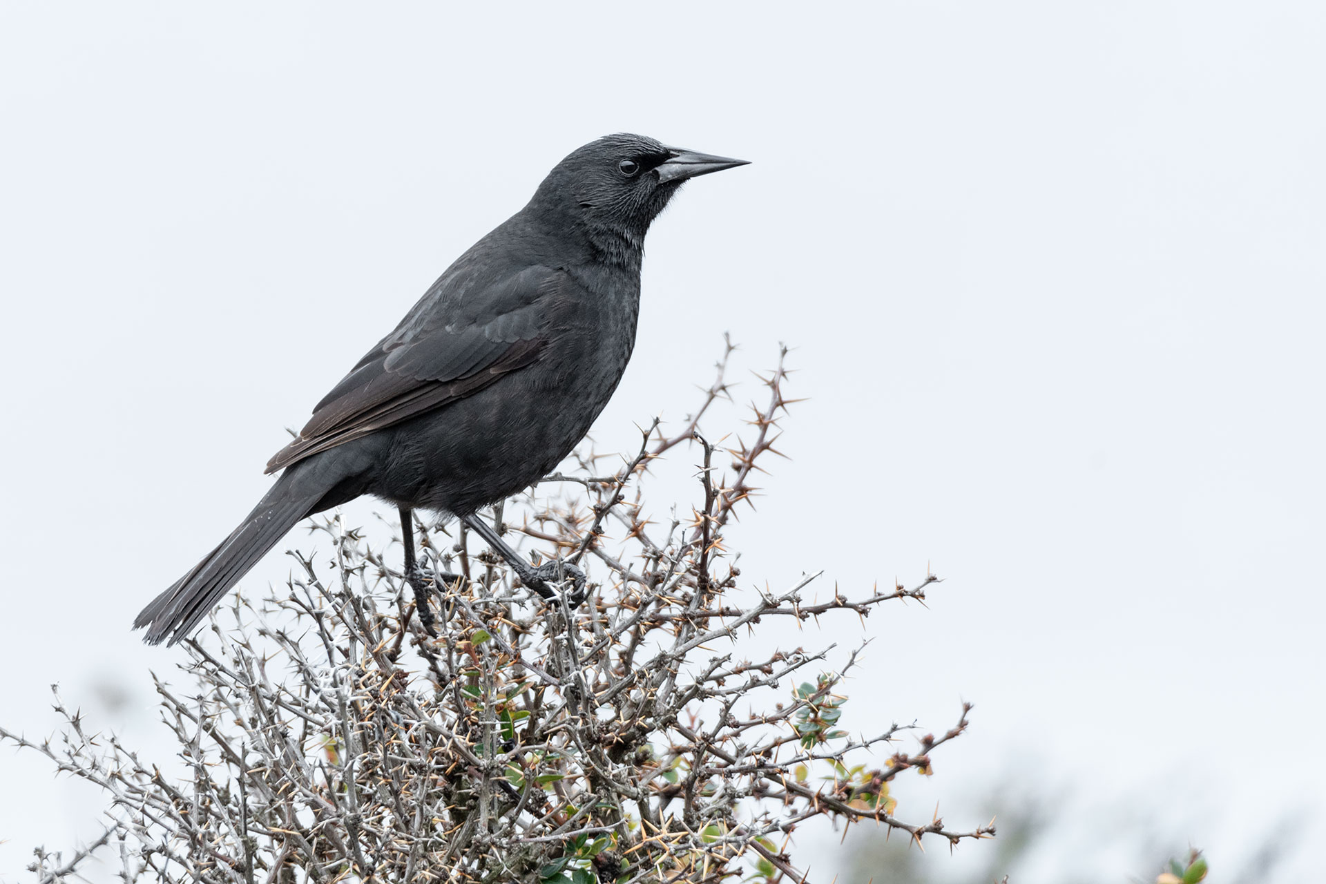 Con plumaje negro brillante y canto metálico, este tordo bullicioso se encuentra todo el año en Magallanes.